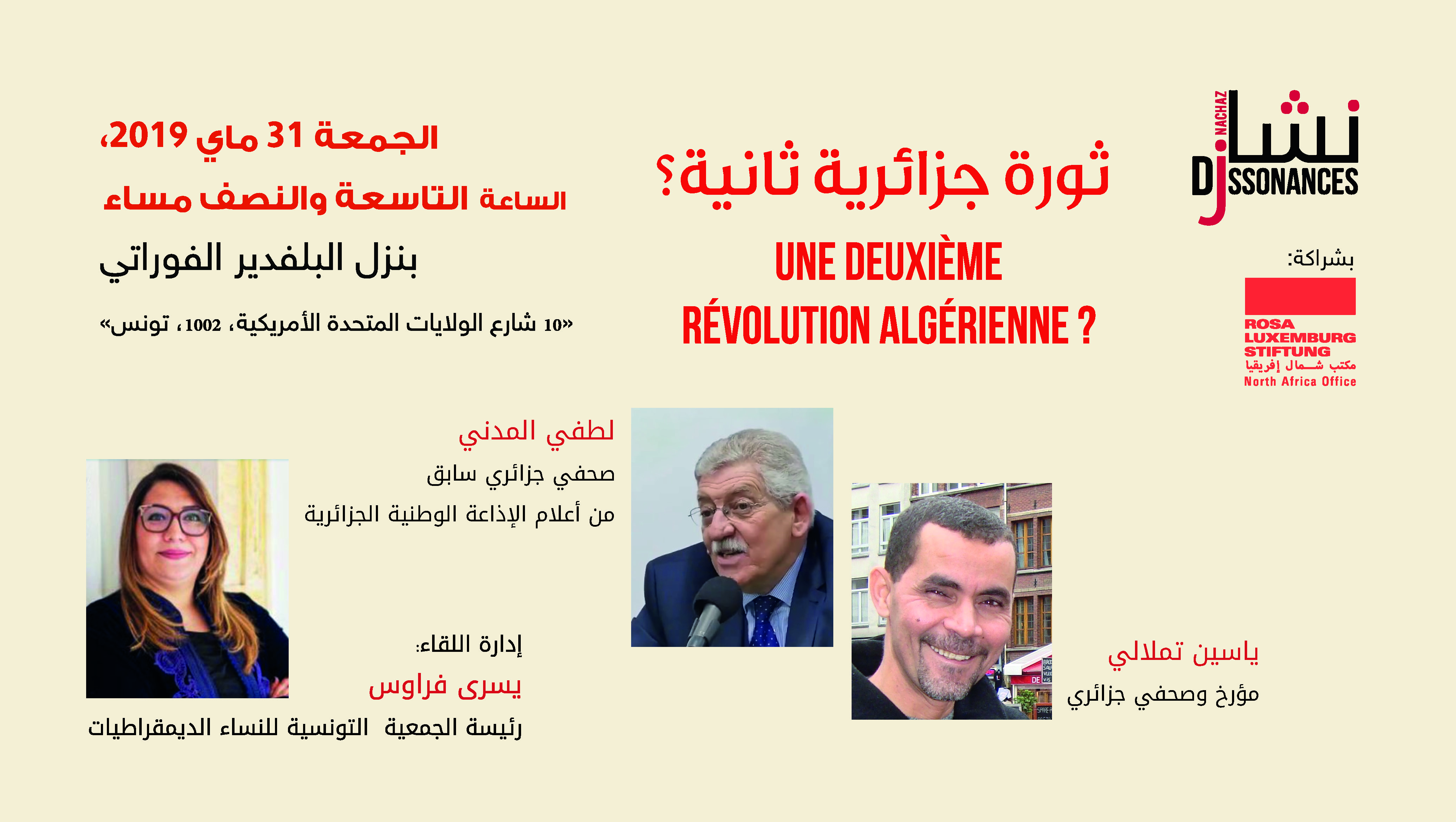 ينشّط اللّقاء الصّديقة يسرى فراوس، محامية ورئيسة الجمعية التونسية للنّساء الدّيمقراطيّات ومبعوثة الفدرالية الدولية لحقوق الإنسان بتونس، تنقلّت حديثا ضمن بعثة إلى الجزائر للتعبير عن تضامن عدد من منظمات المجتمع التونسي مع الحِراك الجزائري.